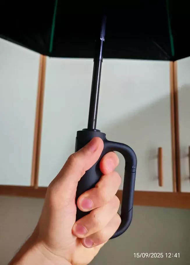 "Este paraguas es lo máximo, tiene un tamaño perfecto, su estructura es muy estable y fuerte frente a vientos fuertes y la lluvia ahora en otoño"
